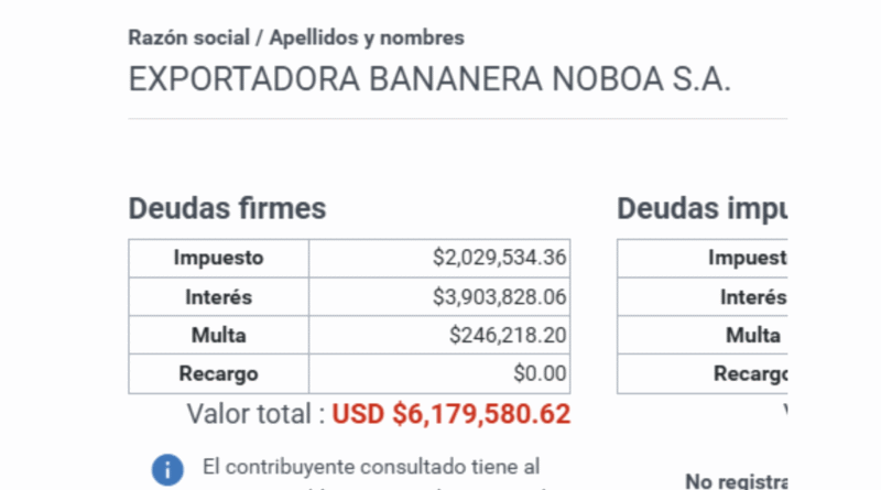 La deuda de Bananera Noboa, de la familia del presidente Daniel Noboa, volvió a ‘desaparecer’. Era la principal deudora tributaria del país con $98’071.242,71, luego bajó a $21 millones. Y esta vez, bajó a $6 millones.