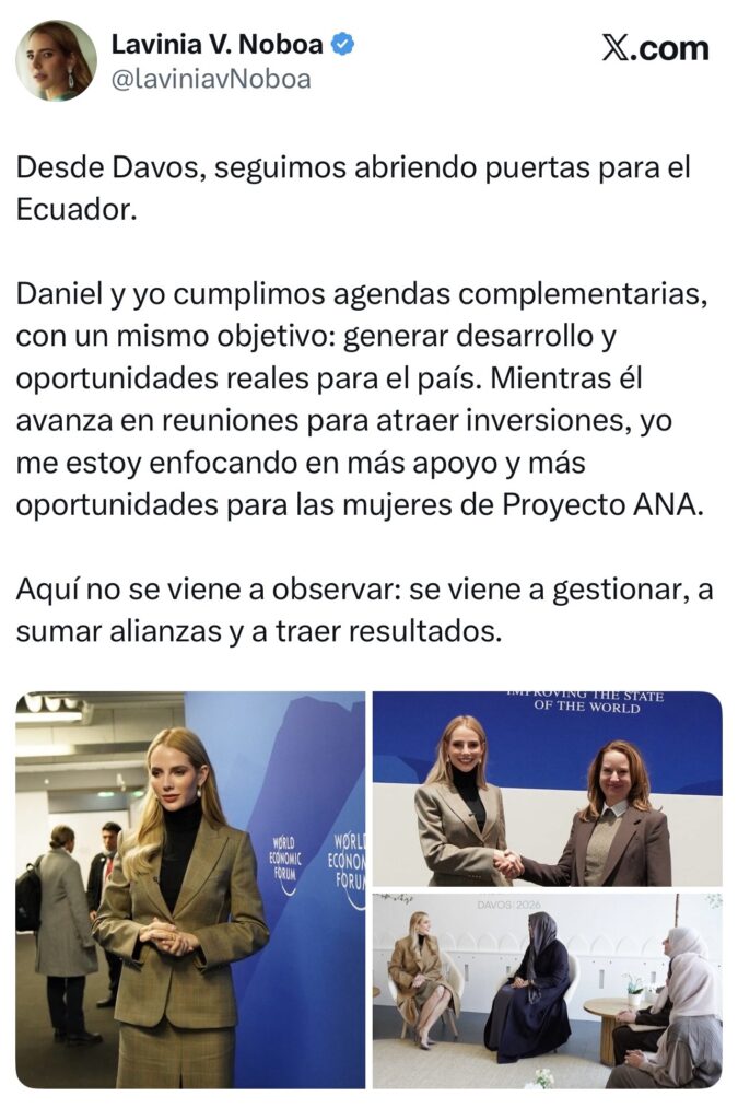 Lavinia Valbonesi, esposa de Daniel Noboa, viajó recientemente a Davos, Suiza, acompañando al presidente, quien participa en el Foro Económico Mundial 2026 como expositor y sosteniendo encuentros con organismos multilaterales como el FMI y líderes empresariales.