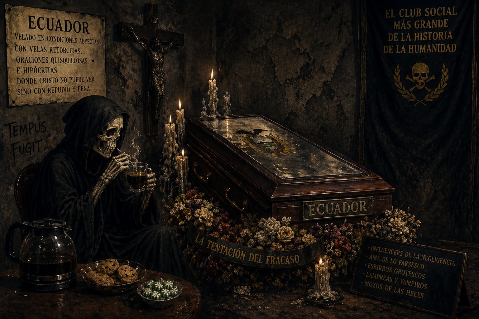 A ellos les debe un trabajo laborioso, algo que ya la tiene harta, agotada y al borde del suicidio y la locura. Gracias a su silencio, puede recorrer entre los murmullos de los deudos, los chismes cargados de estupidez y el velo fino de una extraña confianza de no importarles nada, ni nadie. Su presencia etérea le permite recorrer cada conversación, disfrazada de diplomacia algunas y otras, vulgares, pretenciosas y llanamente imbéciles. Si hay algo que le estorba, le enfurece y le enerva, es escuchar tantas mentiras. Quisiera decirle al Tiempo que acelere su declive, así como lo hacen ellos con otros prójimos a través de tratos bastardos y acuerdos corruptos, pero su respuesta es siempre la misma: Tempus fugit.